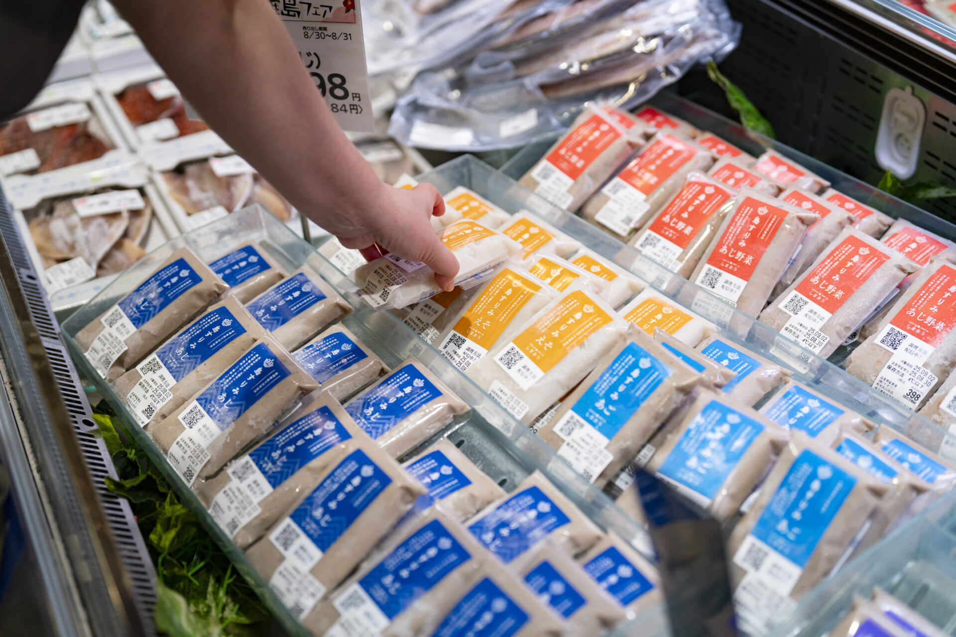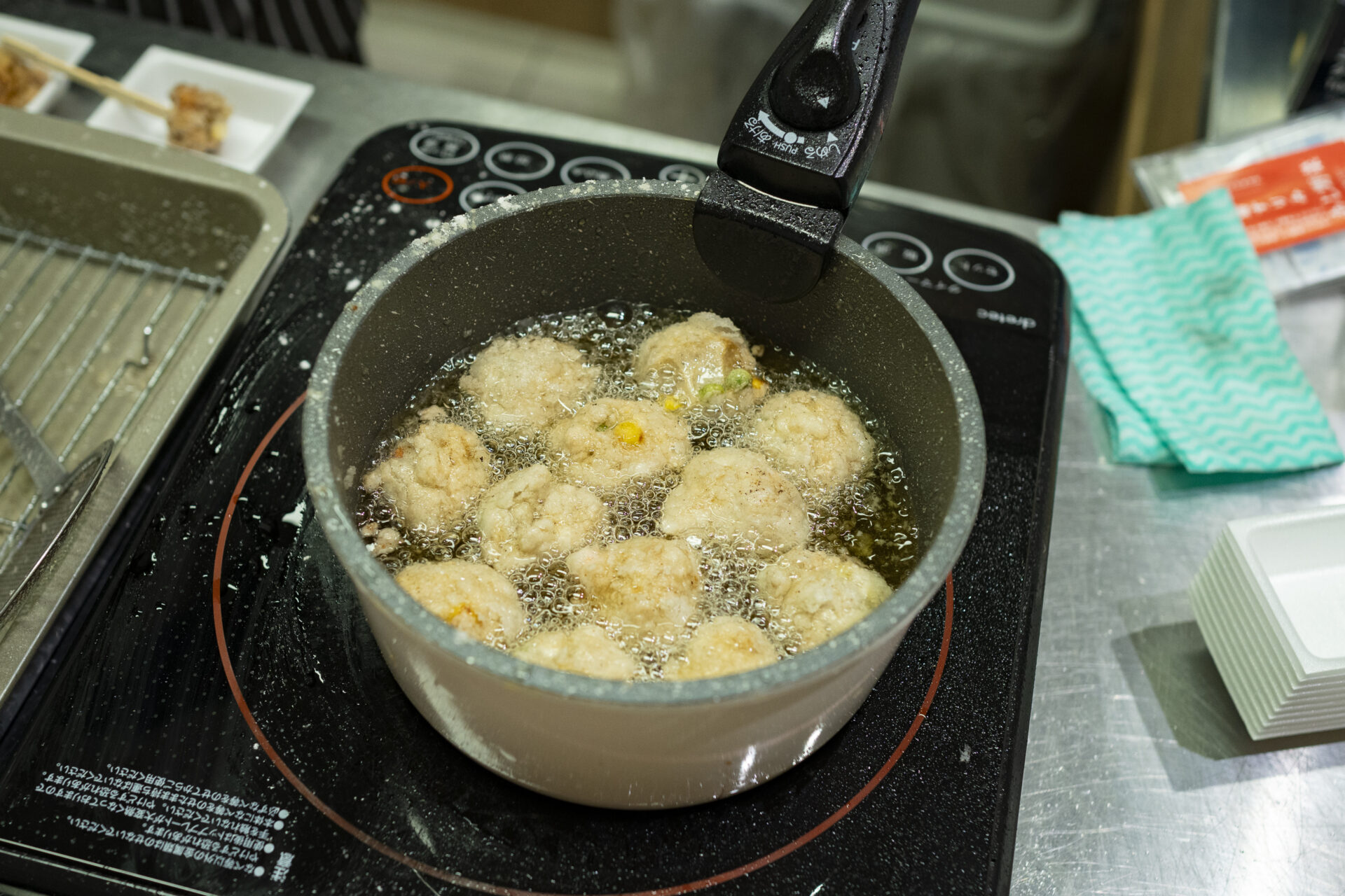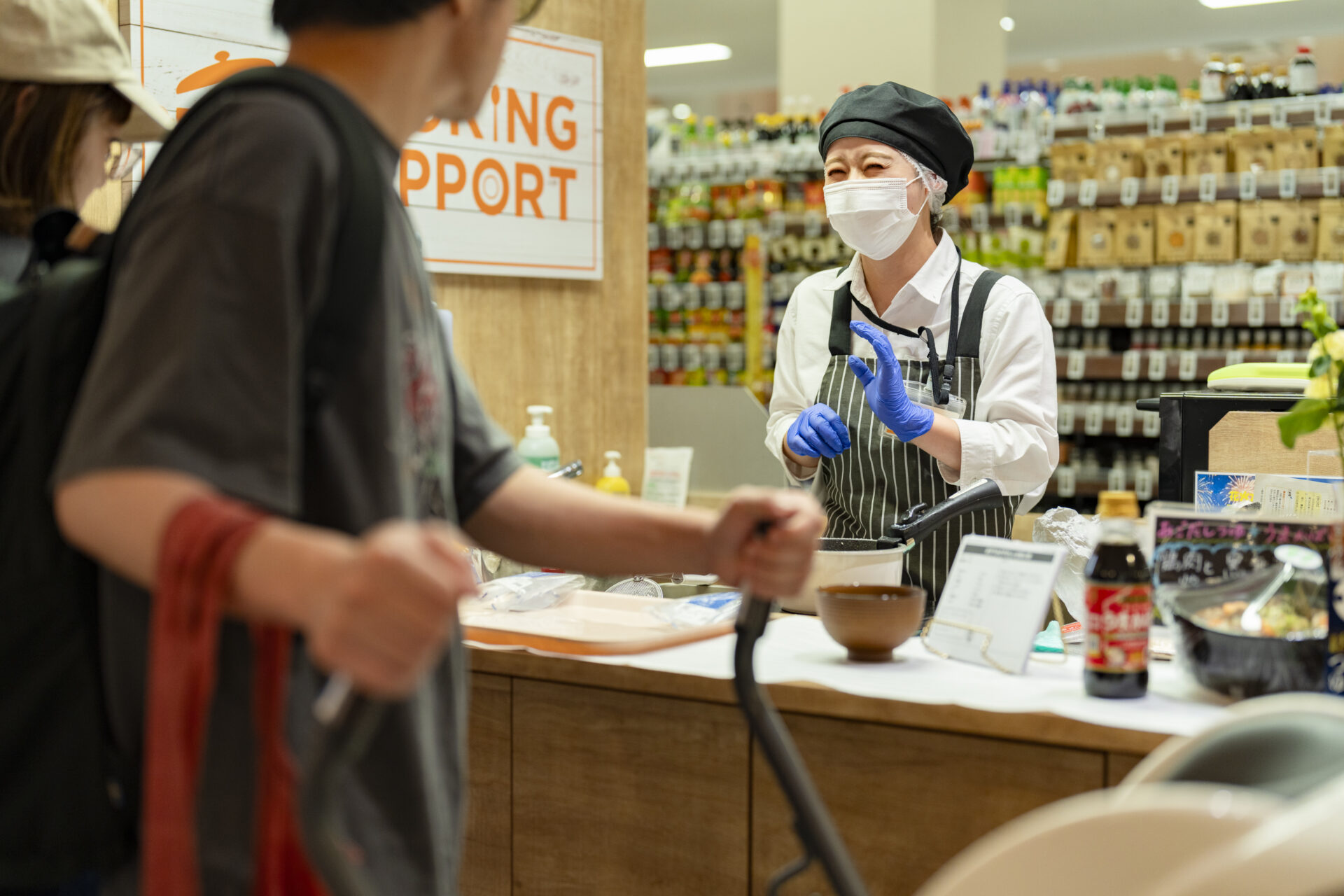提案型サービスコーナーの「クッキングサポート」では、しまおうの「島すりみ」を使ったナゲットとお吸い物の2種のレシピを紹介。試食をしたお客さまが、レシピが書かれた紙を手に島すりみの棚に直行する姿もありました。