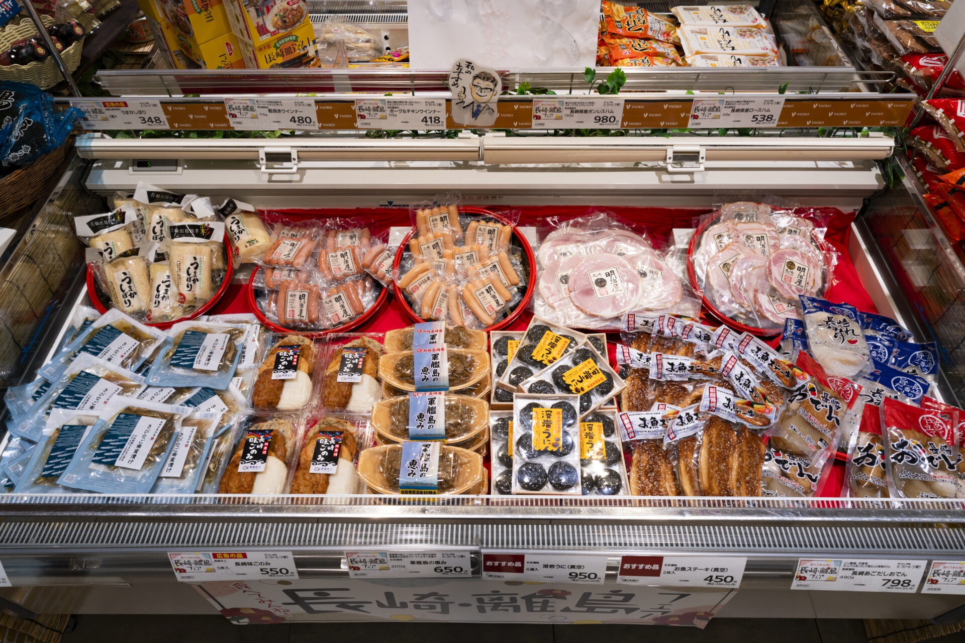 もちろんこのほかにも、焼酎、五島うどん、調味料など、おなじみとなった特産品もずらりと勢ぞろい。鮮魚やアオサをカゴに入れたお客さまが、「こういうのもあるんだね」「これ便利そう」「壱岐牛のカレーだって」「桃かすてらって何?」と、初めて見る長崎・離島の産品を興味深げに手に取っていました。
