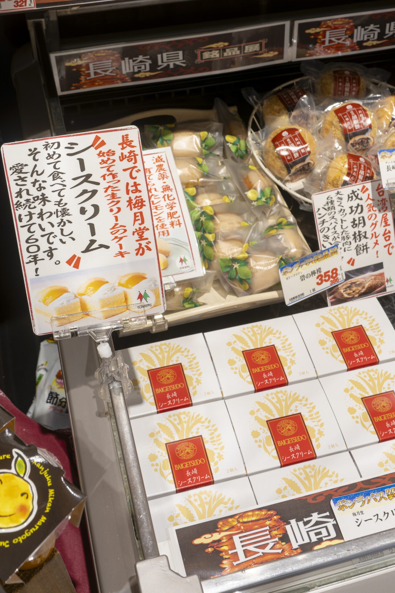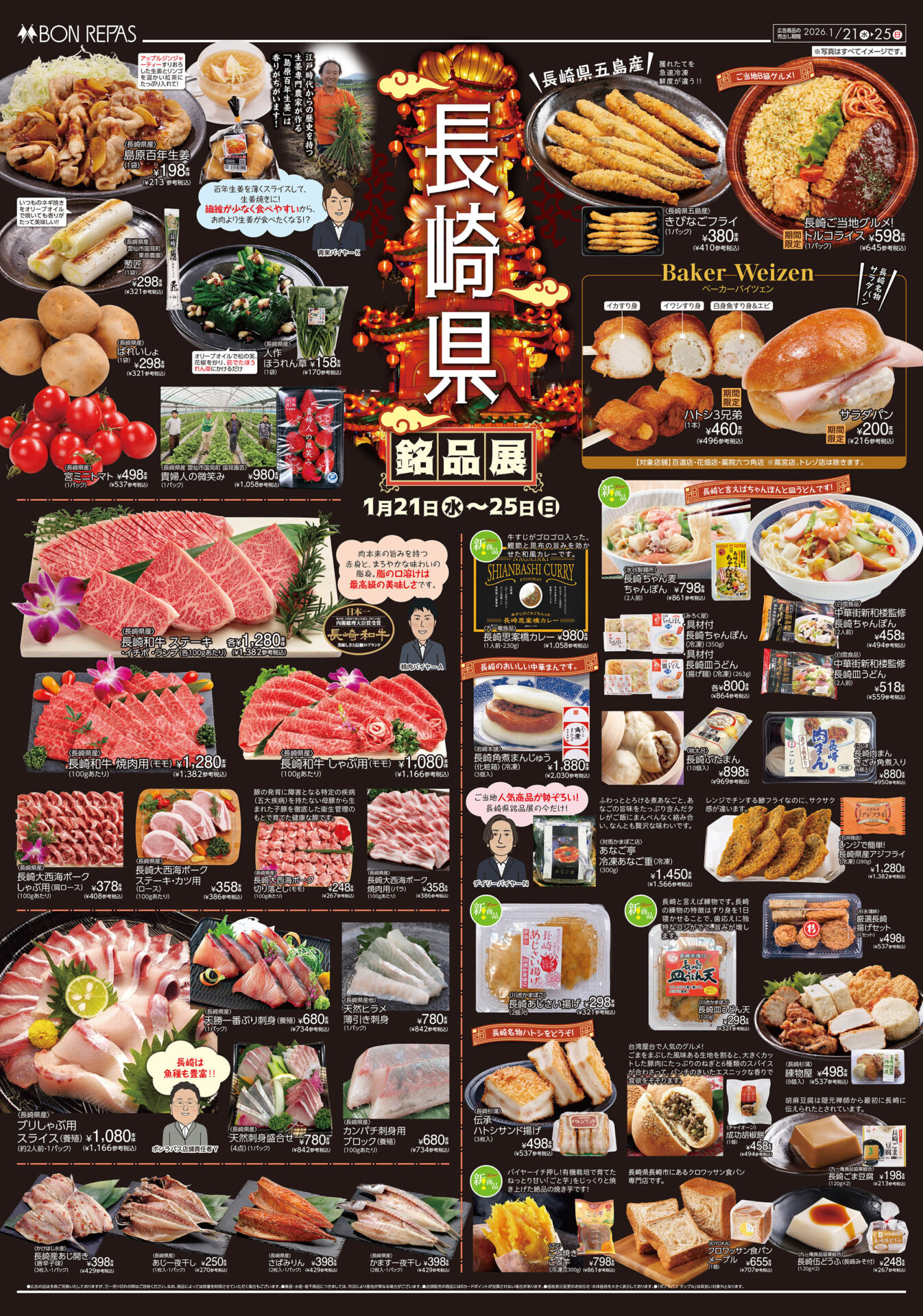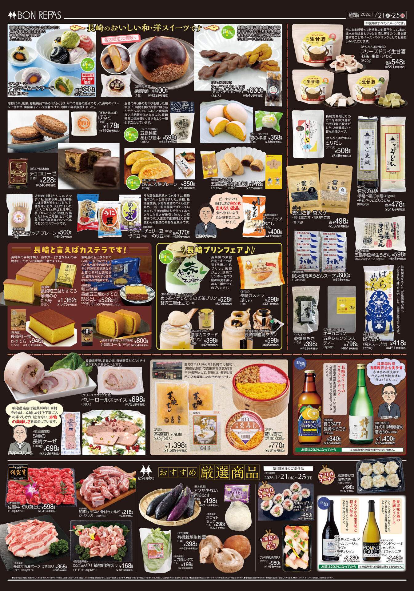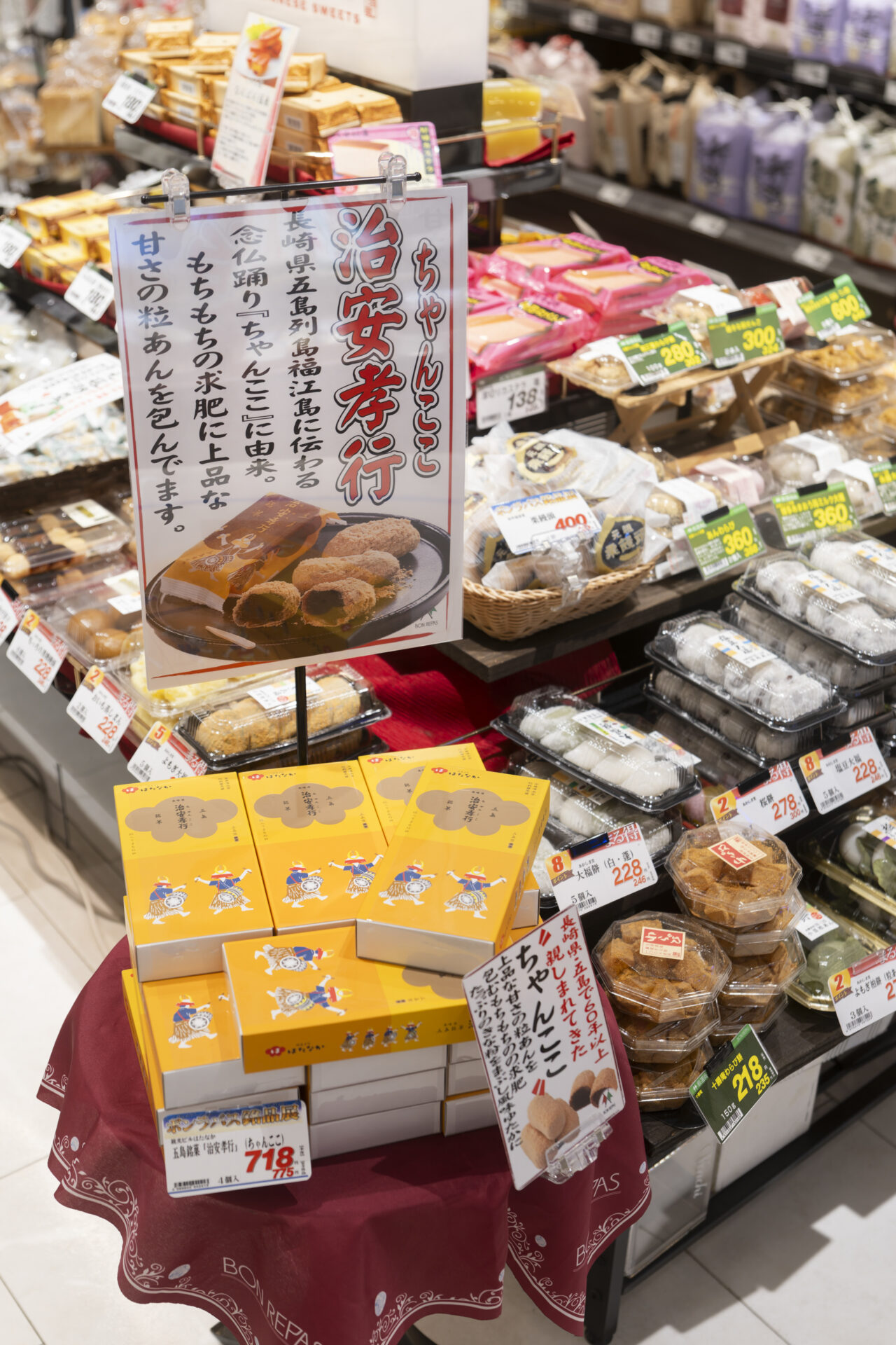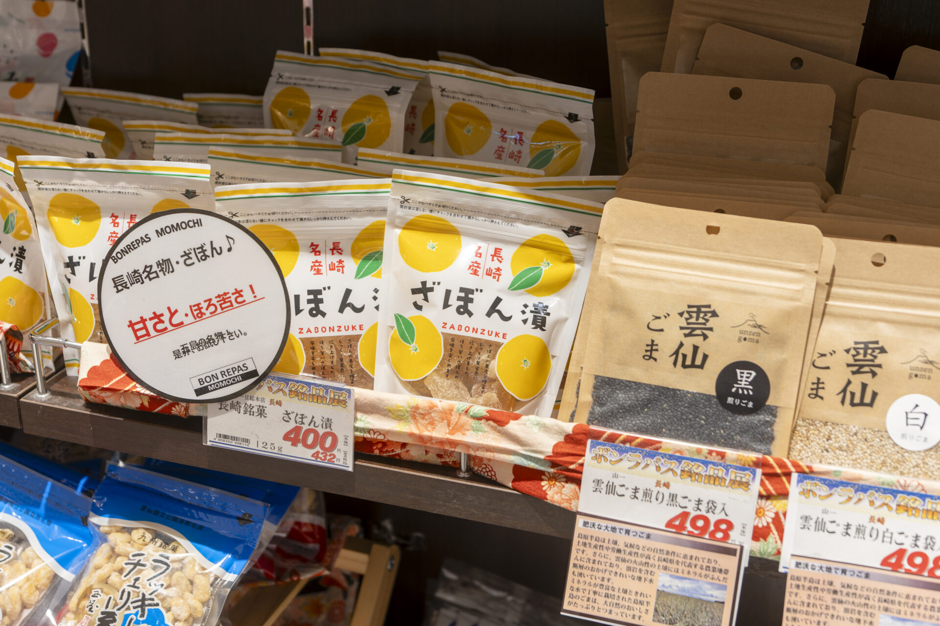 販売・催事 ボンラパス全店で「長崎県銘品展」開催! ボンラパス ハローデイ 2026年1月21日(水)~25日(日)の5日間、会員企業(株)ハローデイ傘下の高質スーパー ボンラパス全店で「長崎県銘品展」が開催されました。 売り場には島原百年生姜(島原市)、きびなご(五島列島)を使ったフライ、近海で漁れた豊かな魚介類などの生鮮品から、シースクリーム、ラッキーチェリー豆、よりよりなどの伝統菓子、島原そうめん、五島手延べうどんなど、長崎県各地から集まった名産品が勢ぞろい。充実の品揃えに、たくさんのお客さまがお買い物を楽しんでいました。