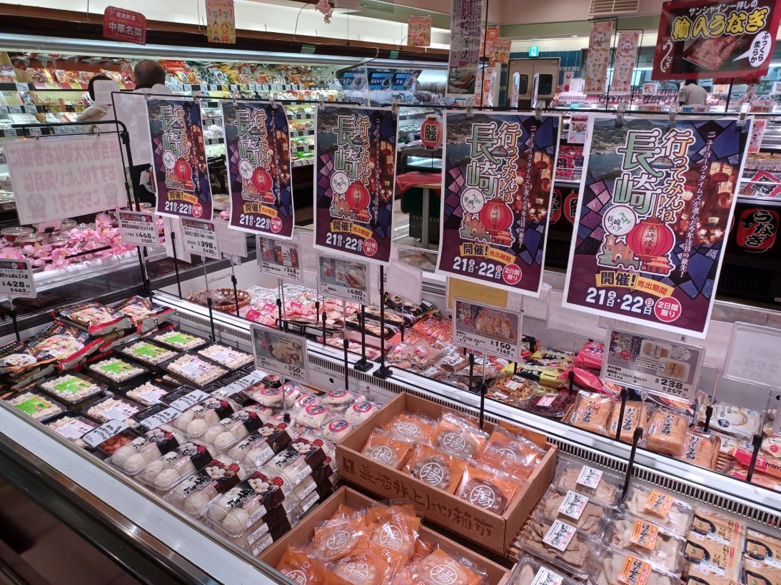 南国市のカルディア店では県内初登場の菓子数種類をはじめ、長崎の多彩な魚種を使用した刺身、寿司、弁当、総菜等を集積した特別催事場を展開。
