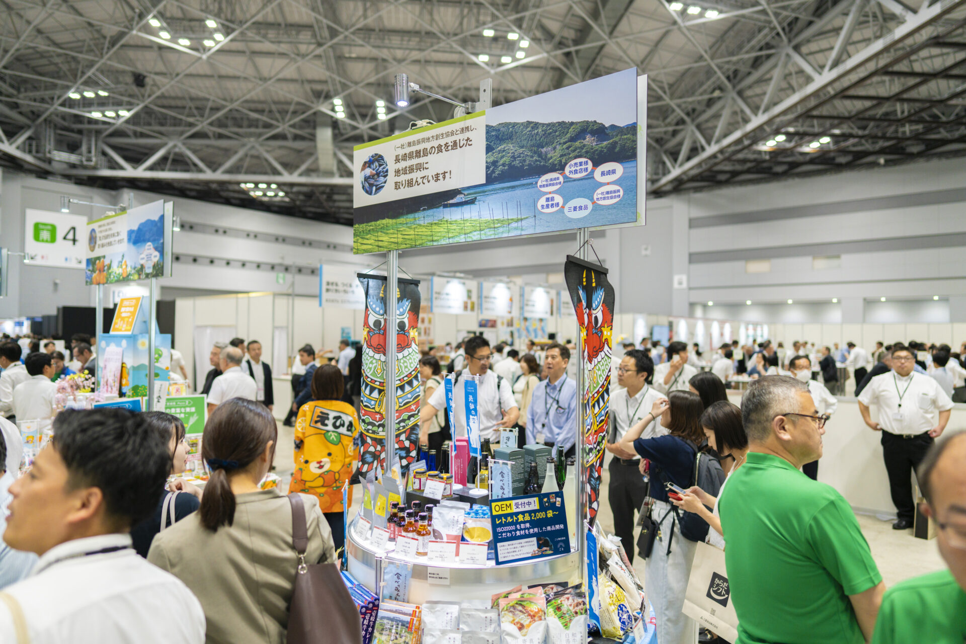 「地域創生コーナー」の長崎離島ブースには、五島うどん、かんころ餅、焼酎、原材料に壱岐牛を使用したレトルト食品など、五島、新上五島、壱岐の定番商品・新商品が勢ぞろい。