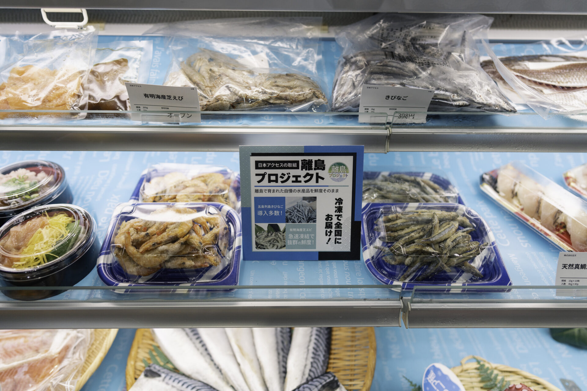 また、会場内に設けられた(株)日本アクセスの提案コーナーでは、五島列島のキビナゴとともに、瞬間個冷凍により、色も味わいもきれいに保たれたままの島原市の「冷凍芝エビ」が、同社の取り組みの一例として紹介されていました。